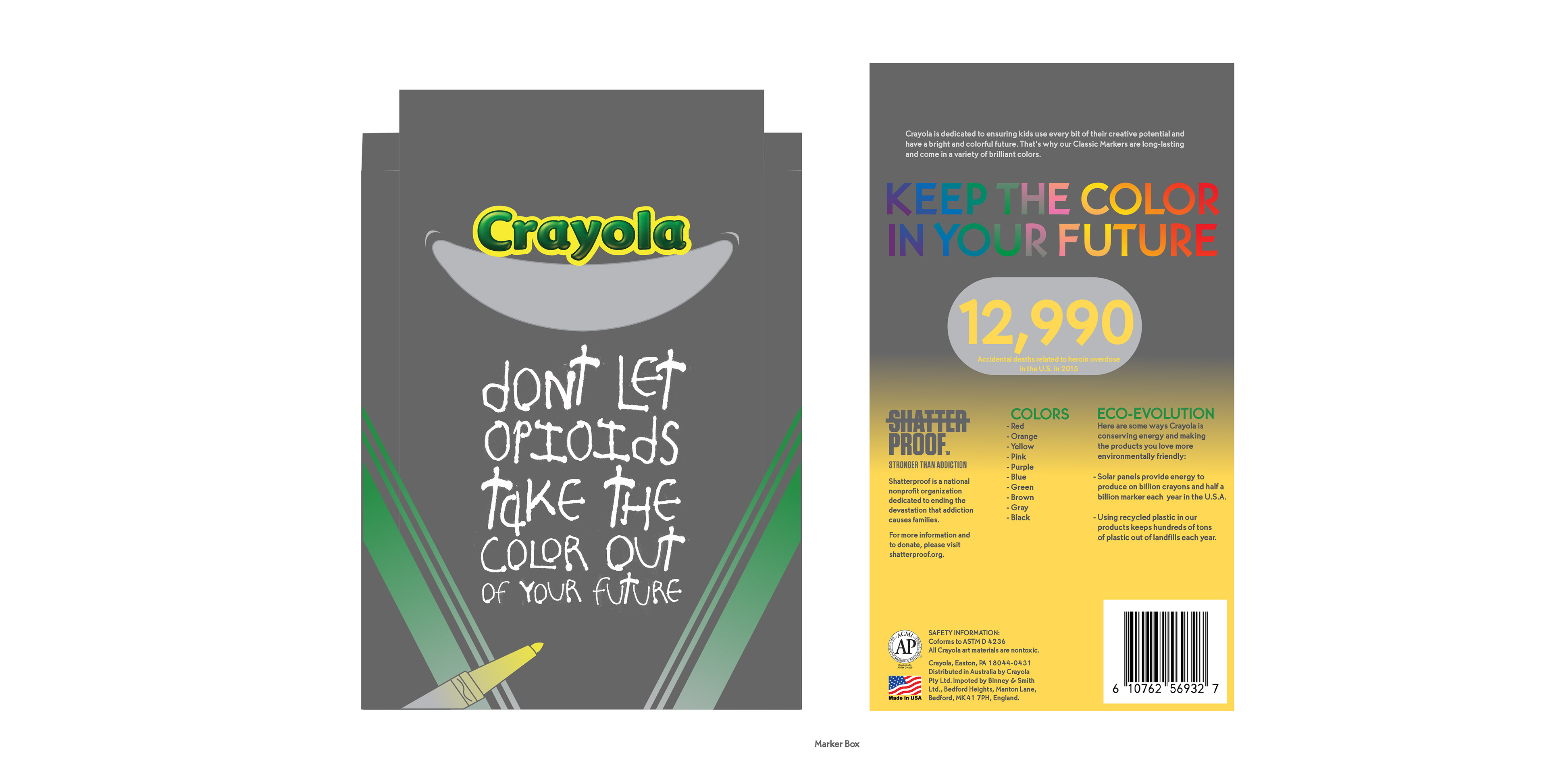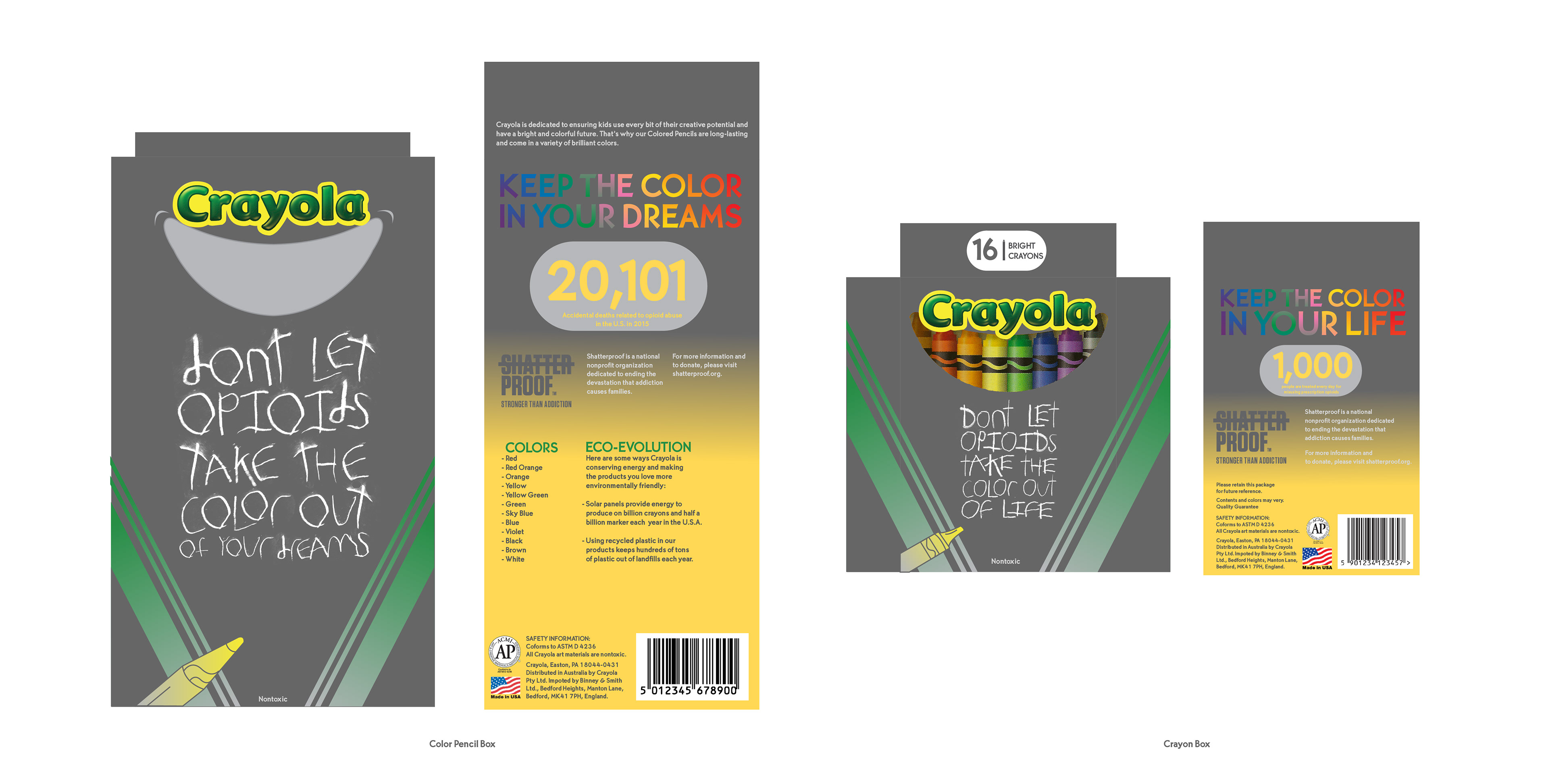 The purpose of this project is to take a common item/product and to create a design that would spread awareness about opioid abuse. Shatterproof and Crayola work towards a colorful future within this campaign. Three packages, a poster, and a motion graphic were created in order to spread the message of "Don't Let Opioids take the Color out of Life."