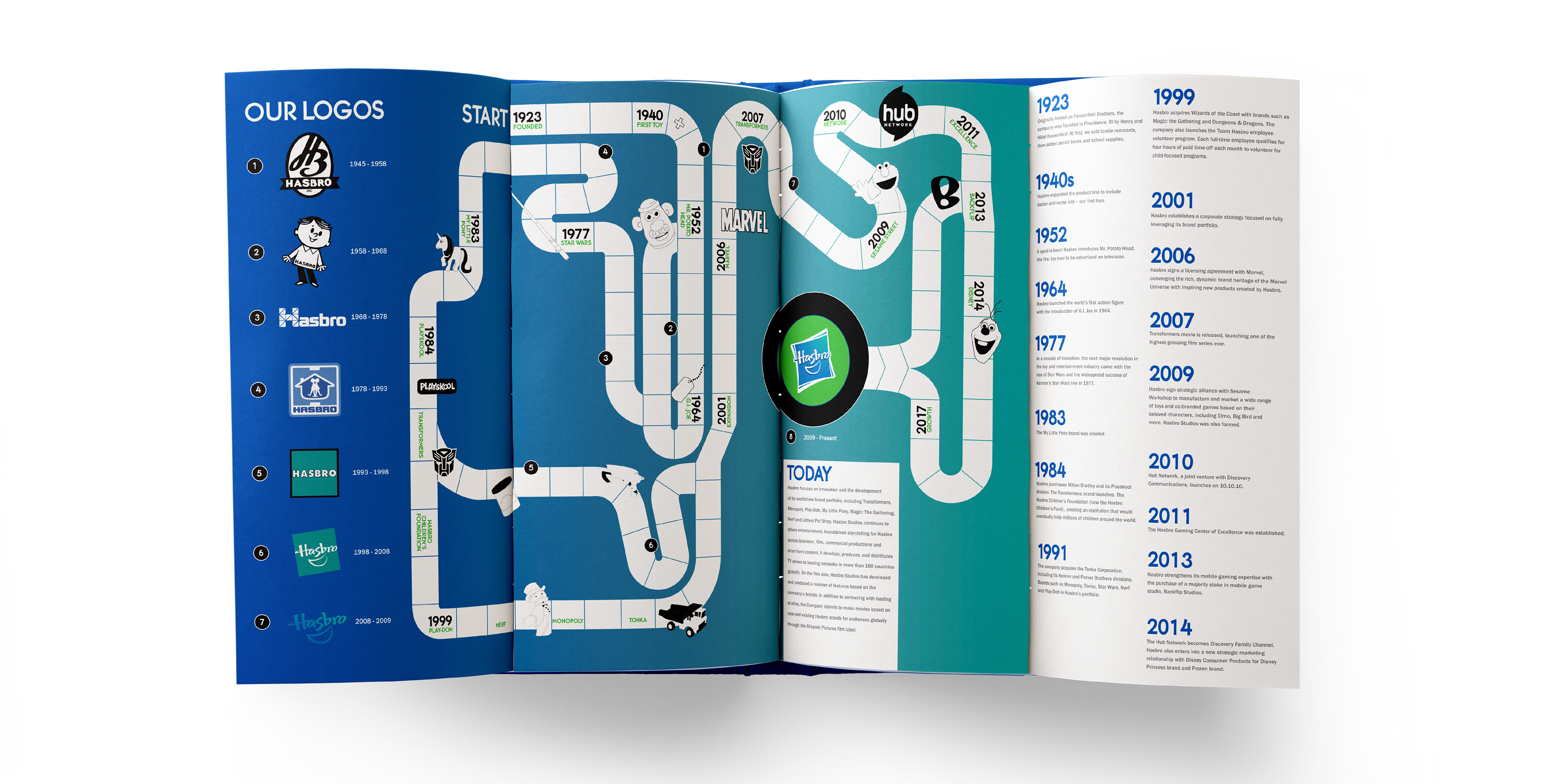 This annual report for Hasbro takes the company back to its roots and has a focus on board games. Each spread tends to be themed around a popular board game and uses illustrations, colors, and playful type to attract the viewer. Patterns are used throughout as well to show the vastness of Hasbro and their company's assets.