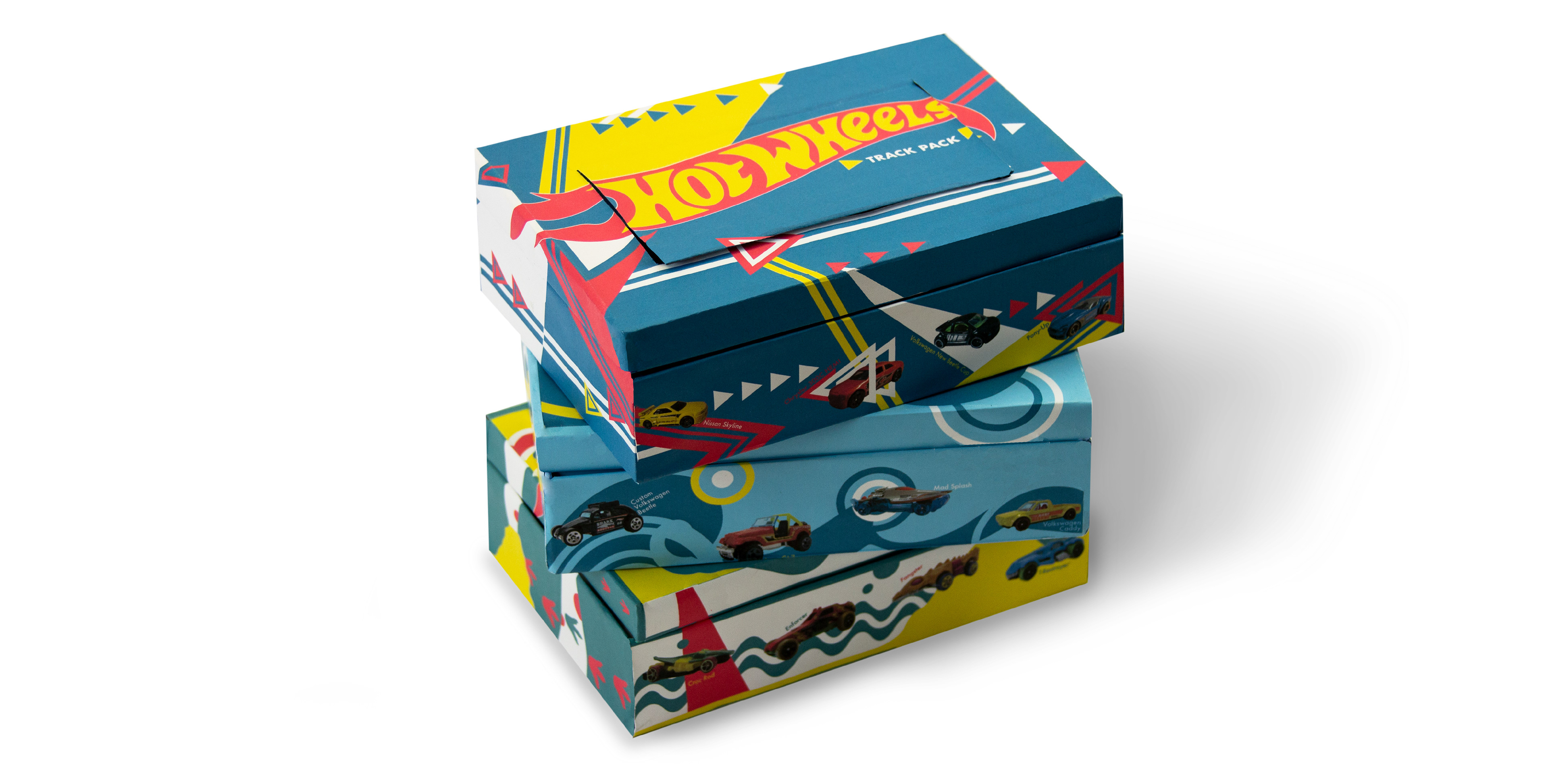 Hot Wheels Track Pack is an exclusive four-pack that allows the packaging to become the track! By cutting down waste, each part of the packaging can be used as a track piece, ramp, or even ring of fire. The packaging uses strong and simple shapes and bold, bright colors in order to capture the attention of the common consumer.